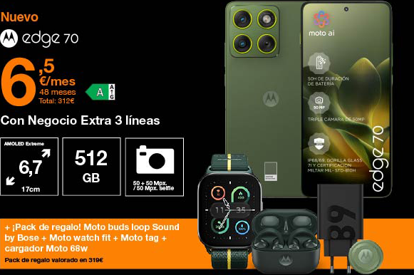 Impuestos indirectos no incluidos. Oferta dispositivos: Disponibles únicamente para nuevas altas o portabilidades en las tarifas indicadas y solo para línea principal. Para otras tarifas, consulte precio del terminal www.orange.es o en el 1414. Precios y promociones válidos hasta fin de vigencia de las mismas, o hasta fin de existencias. Regalos aquí indicados sujetos a contratación de las tarifas y terminal especificados en cada caso, y siempre que el cliente no desista de la contratación. En caso de oferta conjunta de 2 o más productos, el precio solo será aplicable adquiriendo conjuntamente ambos productos, no siendo aplicable para ventas en momentos distintos. Ofertas no acumulables salvo que se indique expresamente lo contrario. Si adquiere dispositivos con venta a plazos de Orange, el compromiso de permanencia en Orange y en la tarifa móvil y de acceso a internet en la tarifa que tenga contratada será el mismo plazo que el nº de cuotas mensuales haya de abonar para completar el pago de su terminal. Oferta sujeta a condiciones generales de Orange, condiciones de tarifa, y en su caso, de venta a plazos. Orange asume la compensación por copia privada aplicable conforme al Real Decreto Legislativo 1/1996 (más info en orange.es, apartado Información legal. Motorola Edge 70: Pago único: 660,33€. Promoción Motorola Edge 70 + Moto Buds Loop, Moto Watch Fit, Moto Tag y Cargador 68W, valorado todo en 319€: válida del 5 de noviembre al 31 de diciembre de 2025 Consulta condiciones en: https://www.redemption.motorola.com/es/es.