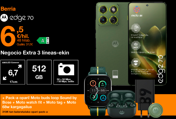 Zeharkako zergak sartu gabe. Gailuen eskaintza: Alta edo eramangarritasun berrietarako soilik eskuragarri, adierazitako tarifetan eta linea nagusirako soilik. Beste tarifa batzuetarako, kontsultatu terminalaren prezioa (www.orange.es edo 1414 telefonoa). Prezioek eta sustapenek balio dute indarrean egon arte, edo izakinak amaitu arte. Hemen adierazitako opariak kasu bakoitzean zehaztutako tarifen eta terminalaren kontratazioaren mende daude, betiere bezeroak kontratazioari uko egiten ez badio. 2 produktu edo gehiagoren eskaintza bateratuaren kasuan, bi produktuak batera erosiz gero bakarrik aplikatu ahal izango da prezioa, eta ez zaie une desberdinetako salmentei aplikatuko. Eskaintzak ezin dira metatu, kontrakorik adierazi ezean. Orangeren epekako salmentako gailuak eskuratuz gero, Orangen eta mugikor-tarifan eta Internetera sartzeko tarifan kontratatuta daukan tarifaren iraunkortasun-konpromisoa izango da terminalaren ordainketa osatzeko abonatu beharreko hileko kuoten kopurua bera. Eskaintza hau Orangeren baldintza orokorren mende dago, tarifa-baldintzen mende, eta, hala badagokio, epekako salmentaren baldintzen mende. Orangek bere gain hartzen du kopia pribatuarengatiko konpentsazioa, 1/1996 Legegintzako Errege Dekretuaren arabera (info gehiago orange.es webguneko Lege Informazioa atalean). Motorola Edge 70: Ordainketa bakarra: 660,33€ Motorola Edge 70 + Moto Buds Loop, Moto Watch Fit, Moto Tag eta 68W kargagailua sustapena, guztia 319€-tan baloratua: 2025eko azaroaren 5etik abenduaren 31ra baliagarria Ikus baldintzak hemen: https://www.redemption.motorola.com/es/es.