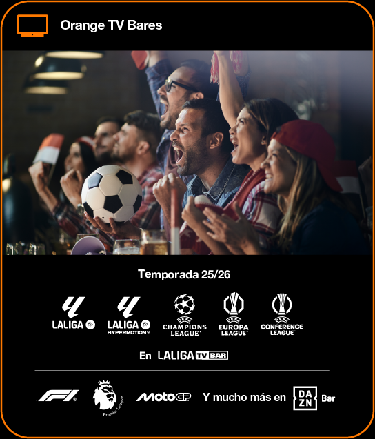 Impuestos indirectos no incluidos. Condiciones aplicables Temporada 2025-2026 salvo que se establezca otro período de aplicación. Orange TV Bares: Dirigida únicamente a bares, restaurantes y cafeterías (NIF/CIF), no ubicados en hoteles, ni locales de apuestas, en zonas de cobertura directa, que tengan una tarifa Love Empresa Impulsa o Crece o tarifa Empresa Impulsa o Crece. No se permite su uso en terrazas abiertas (sólo aquéllas cerradas por al menos 3 lados), ni en espacios abiertos, ni para su visualización en locales contiguos; tampoco se permite su uso en centros comerciales (o espacios equivalentes), o espacios públicos, incluyendo en el exterior o interior de estadios deportivos. Incluye los contenidos y canales indicados en https://www.orange.es/empresas/servicios/tv-bares, y la oferta de contenidos multideporte de DAZN disponible en cada momento. Precios aplicables hasta el 31 de diciembre de 2025 y según la localidad en la que se encuentre el local (menos de 10.000 habitantes: 285€/mes; 10.000 – 45.000 habitantes: 310€/mes; 45.0001 – 250.000 habitantes: 330€/mes; más de 250.000 habitantes: 355€/mes), sujeto a que el cliente se mantenga dado de alta en una tarifa Love Empresa Impulsa o Crece o tarifa Empresa Impulsa o Crece. En caso de cambio de titularidad, el precio aplicable será el vigente en ese momento. Gastos de instalación (150€) bonificados, siempre que el cliente se mantenga dado de alta en Orange TV Bares durante al menos 6 meses desde su activación; en caso de baja antes del vencimiento de ese plazo de 6 meses, Orange facturará al cliente la parte proporcional de los gastos de instalación no amortizados, calculada en función del tiempo que le reste al cliente por cumplir de dicho plazo. La baja en el pack Love Empresa o pack Empresa conllevará también la baja automática en Orange TV Bares. Orange TV Bares Hoteles y Orange TV Locales de Apuestas sujetos a condiciones especiales, consulte precio y condiciones en su punto de venta, con su asesor comercial o en el 1471. Precios impuestos indirectos no incluidos