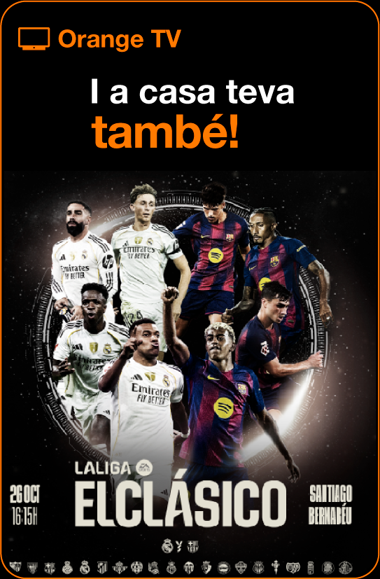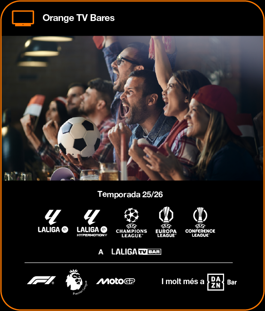 Impostos indirectes Condicions aplicables Temporada 2025-2026 tret que s'estableixi un altre període d'aplicació. Orange TV Bares: Dirigida únicament a bars, restaurants i cafeteries (NIF/CIF), no situats en hotels, ni locals d'apostes, en zones de cobertura directa, que tinguin una tarifa Love Empresa Impulsa o Crece o tarifa Empresa Impulsa o Crece. No es permet el seu ús en terrasses obertes (només aquelles tancades per almenys 3 costats), ni en espais oberts, ni per a la seva visualització en locals contigus; tampoc es permet el seu ús en centres comercials (o espais equivalents), o espais públics, incloent en l'exterior o interior d'estadis esportius. Inclou els continguts i canals indicats en https://www.orange.es/empresas/servicios/tv-bares, i l'oferta de continguts multiesport de DAZN disponible a cada moment. Preus aplicables fins al 31 de desembre de 2025 i segons la localitat en la qual es trobi el local (menys de 10.000 habitants: 285€/mes; 10.000 – 45.000 habitants: 310€/mes; 45.0001 – 250.000 habitants: 330€/mes; més de 250.000 habitants: 355€/mes), subjecte al fet que el client es mantingui donat d'alta en una tarifa Love Empresa Impulsa o Creix o tarifa Empresa Impulsa o Creix. En cas de canvi de titularitat, el preu aplicable serà el vigent en aquest moment. Despeses d'instal·lació (150€) bonificats, sempre que el client es mantingui donat d'alta en Orange TV Bares durant almenys 6 mesos des de la seva activació; en cas de baixa abans del venciment d'aquest termini de 6 mesos, Orange facturarà al client la part proporcional de les despeses d'instal·lació no amortitzats, calculada en funció del temps que li resti al client per complir d'aquest termini. La baixa en el lot Love Empresa o lot Empresa comportarà també la baixa automàtica en Orange TV Bares. Orange TV Bares Hotels i Orange TV Locals d'Apostes subjectes a condicions especials, consulti preu i condicions al punt de venda, amb el seu assessor comercial o en el 1471. Preus imposats indirectes no inclosos.