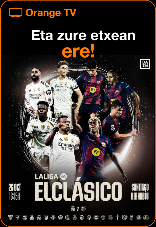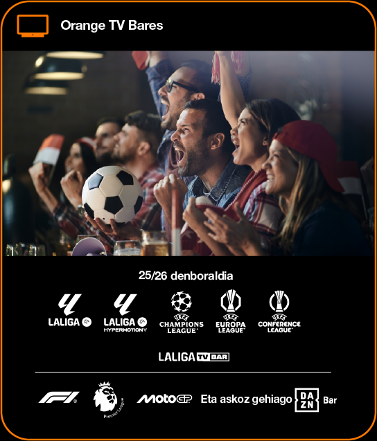 Zeharkako zergak sartu gabe. 2025-2026 denboraldian aplikatzeko baldintzak, beste aldi bat ezarri ezean.. Orange TV Bares: Hoteletan edo apustu-lokaletan kokatuta ez dauden taberna, jatetxe eta kafetegiei zuzenduta dago soilik (IFZ/IFK), zuzeneko estaldura duten eremuetan, Love Empresa Impulsa o Crece tarifa badute. Ez da onartzen terraza irekietan erabiltzea (gutxienez 3 aldetatik itxitakoak bakarrik), ez espazio irekietan, ez ondoko lokaletan bistaratzeko; ez eta merkataritza-zentroetan (edo antzeko espazioetan) edo espazio publikoetan erabiltzea ere, kirol-estadioen kanpoaldean edo barrualdean barne. Https://www.orange.es/empresas/servicios/tv-bares webgunean adierazitako edukiak eta kanalak barne, eta baita une bakoitzean eskuragarri dagoen DAZNeko multikiroleko edukien eskaintzan ere. 2025eko abenduaren 31ra arte aplikatu beharreko prezioak, lokala dagoen udalerriaren arabera (10.000 biztanle baino gutxiago: 285€/hilabetea; 10.000– 45.000 biztanle: 310€/hilabetea; 45,0001– 250.000 biztanle: 330€/hilabetea; 250.000 biztanletik gora: 355€/hilabetea), bezeroa Love Empresa Impulsa edo Crece tarifa batean edo Empresa Impulsa edo Crece tarifa batean altan emanda badago. Titulartasuna aldatuko balitz, une horretan indarrean dagoen prezioa aplikatuko da. Instalazio-gastu hobarituak (150 €), bezeroak Orange TV Bares zerbitzuan alta emanda jarraitzen badu aktibatzen denetik gutxienez 6 hilabetez; 6 hilabeteko epe hori amaitu aurretik baja emanez gero, Orangek amortizatu gabeko instalazio-gastuen zati proportzionala fakturatuko dio bezeroari, epe hori betetzeko bezeroari geratzen zaion denboraren arabera kalkulatuta. Love Empresa edo Empresa paketean baja emateak Orange TV Baresen baja automatikoa ere ekarriko du. Orange TV Bares Hoteles eta Orange TV Locales de Apuestas zerbitzuek baldintza bereziak dituzte, kontsultatu prezioa eta baldintzak zure salmenta puntuan, zure merkataritza-aholkulariarekin edo 1471 zenbakian. Zeharkako zergen prezioak kanpo