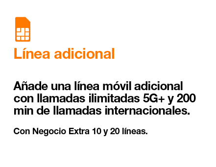 Líneas Adicionales móvil Negocio: Compatibles con las tarifas Negocio Negocio Base y Negocio Base Plus. Línea móvil Negocio Sin Límites, que Incluye las mismas características de tráfico de voz y datos de la línea móvil asociada a la tarifa y Línea móvil Negocio 250 min, que incluyen datos nacionales ilimitados y 250 minutos de llamadas nacionales, con las exclusiones indicadas anteriormente Líneas adicionales Smartphone Negocio. Compatibles con las tarifas Negocio Extra, incluyendo Línea Smartphone Negocio Sin Límites, y que ofrecen las mismas características que las líneas móviles asociadas a cada tarifa y la Línea Smartphone Negocio 250 min que incluyen datos nacionales ilimitados y 250 minutos de llamadas nacionales, con las exclusiones indicadas anteriormente. Precio promocional cuota base Línea Adicional 8,22€ durante 24 meses: A los clientes que den de alta, porten o migren de prepago una línea adicional asociada a un Pack Negocio Base Plus o Negocio extra, se les aplicará el precio promocional arriba indicado durante 24 meses desde la activación del servicio, aplicable desde 1ª factura.