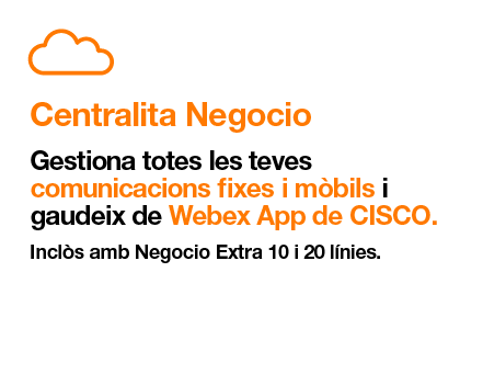 Característiques comunes de les tarifes Negocio: Servei convergent: Inclou fibra òptica amb diferents velocitats segons la tarifa contractada. La tarifa Negocio Base ofereix fibra simètrica de fins a 600 Mbps. Les tarifes Negocio Base Plus, Negocio Extra 1 línia, Negocio Extra 3 línies i Negocio Extra 5 línies inclouen fibra simètrica de fins a 1 Gbps. Les tarifes Negocio Extra 10 línies i Negocio Extra 20 línies disposen de fibra asimètrica de fins a 2 Gbps/1 Gbps en zones amb cobertura compatible. Inclou una línia fixa amb trucades nacionals il·limitades i tantes línies mòbils 5G+ com indiqui la tarifa, sent una en el cas de les tarifes Negocio Base. A més, ofereix trucades nacionals il·limitades i 200 minuts mensuals en trucades internacionals de mòbil a fixos i mòbils en més de 50 països. Les trucades internacionals només estan incloses en les tarifes Negocio Extra. Queden exclosos de les tarifes qualsevol tràfic a números de tarifació especial o addicional, SMS Premium, MMS, tràfic internacional diferent de l'inclòs expressament i tràfic en roaming fora de l'EEE (tarifes i països disponibles a www.orange.es). El servei mòbil inclou dades nacionals il·limitades a una velocitat de navegació de fins a 1Gbps, per al seu ús privatiu raonable i sense finalitats comercials. Inclou un bo de 60GB/línia en roaming EEE (excepte les tarifes Negocio Base, que compten amb un bo de 45 GB en roaming EEE); una vegada esgotat el bo o els GB de la tarifa, els GB en roaming EEE es facturaran a 1,48€/GB (IVA inclòs). Negocio Extra 10 i 20 línies inclouen a més Centralita Negocio, amb 1 lloc Fix avançat i DDIs addicionals sense cost (més info a www.orange.es). Permanència en tarifa de 12 mesos, excepte si s'adquireix dispositiu en modalitat de venda a terminis, en aquest cas el CP en tarifa i terminal serà de 24 o 48 mesos segons nombre de quotes (no aplicable per a adquisicions de dispositius en la modalitat de Venda a Terminism sense CP, sempre que així s'indiqui expressament en el document de compra), o de 24 mesos per al cas d'activació del producte Centralita Negocio. Totes les ofertes amb pagament ajornat a 48 quotes estan també disponibles en modalitat a 24 mesos. Tarifa Negocio Base: Inclou trucades nacionals il·limitades (amb les restriccions indicades anteriorment) i dades il·limitades, amb 100 GB a velocitat de fins a 1 Gbps per a la línia mòbil associada, per a ús privat, raonable i sense finalitats comercials; posteriorment, la velocitat es redueix a 2 Mbps. A més, inclou un bo de 45 GB en roaming EEE i fibra simètrica de fins a 600 Mbps. Aquesta tarifa està limitada a un màxim de 2 línies mòbils. Tarifa Negocio Base Plus: Inclou trucades nacionals il·limitades (amb les restriccions indicades anteriorment), dades mòbils il·limitades nacionals a una velocitat de fins a 1 Gbps per a la línia mòbil associada, per a ús privat, raonable i sense finalitats comercials, a més d'un bo de 45 GB en roaming EEE i TV de 90 canals d'Orange. També inclou fibra simètrica de fins a 1 Gbps. Aquesta tarifa no té límit en el nombre de línies mòbils. Tarifes Negocio Extra 1, 3 i 5 línies: Inclouen trucades nacionals il·limitades (amb les restriccions indicades anteriorment), dades mòbils il·limitades nacionals a una velocitat de fins a 1 Gbps per a cada línia mòbil associada, per a ús privat, raonable i sense finalitats comercials, a més d'un bo de 60 GB en roaming EEE i 200 minuts/línia mòbil mensuals en trucades internacionals de mòbil a fixos i mòbils en més de 50 països. També inclouen fibra simètrica de fins a 1 Gbps. Aquestes tarifes no tenen límits en el nombre de línies mòbils. Tarifes Negocio Extra 10 i 20 línies: Inclouen trucades nacionals il·limitades (amb les restriccions indicades anteriorment), dades mòbils il·limitades nacionals a una velocitat de fins a 1 Gbps per a les línies mòbils associades, per a ús privat, raonable i sense finalitats comercials, a més d'un bo de 60 GB en roaming EEE i 200 minuts/línia mòbil mensuals en trucades internacionals de mòbil a fixos i mòbils en més de 50 països. També inclouen fibra asimètrica de fins a 2 Gbps/1 Gbps. Aquestes tarifes no tenen límit en el nombre de línies mòbils. Les tarifes Negocio Extra inclouen a més bo de 1.000 min/mes en trucades de fixos a fixos de fins a 50 països, excloent trucades a números mòbils, de tarifació especial o addicional en aquests països (+info països inclosos en el bo “trucades internacionals” i rangs exclosos, disponible a www.orange.es).