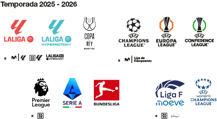 Emissió de la temporada 2025-2026 de les competicions de futbol nacionals LALIGA EA SPORTS, LALIGA HYPERMOTION V i LLIGA F MOEVE, les competicions continentals de la UEFA: Champions League, Europa League i Conference League i les lligues europees Premier League, Sèrie A i BUNDESLIGA. Els canals habilitats per a l'emissió d'aquests continguts són M LALIGA, DAZN LALIGA, LALIGATV HYPERMOTION V, M Lliga de Campions i la plataforma DAZN, propietaris o llicenciataris dels drets de l'emissió d'aquests. Aquestes competicions podran visualitzar-se en un sol dispositiu, ja sigui a través de l'app d'Orange TV o a través del descodificador en cessió que es lliura en determinades tarifes.