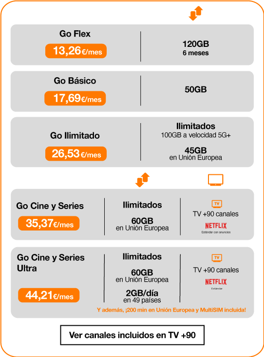 Tarifas Go: Todas las tarifas incluyen llamadas ilimitadas a fijos y móviles nacionales y en roaming en Zona 1 -UE, Islandia, Liechtenstein, Noruega, Gibraltar, Ucrania y Moldavia. Tarifas de uso exclusivo para clientes particulares en calidad de usuario final sin fines comerciales. Precios no válidos para transformación o conversión de llamadas incluido redireccionamiento del tráfico, descargas masivas de tráfico telefónico o de datos, conductas que respondan a un patrón de fraude, uso anómalo, ilícito y/o desmesurado del Servicio. En caso de que utilice el servicio con los anteriores fines, así como en supuestos de fraude, Orange podrá tarificar el tráfico conforme al precio base de llamadas (0,22€/minuto y 0,27€ de establecimiento de llamada) o suspender o interrumpir el servicio. SMS: 0,22€. Las tarifas Go Cine y Series Ultra y Go Cine y Series incluyen datos ilimitados sin restricción de velocidad, destinados a un uso particular razonable y sin fines comerciales, no pudiéndose realizar un uso abusivo de los mismos -p.ej. descargas permanentes de contenidos o aplicaciones de videovigilancia-. La tarifa Go ilimitada incluye datos ilimitados con restricción de velocidad a partir de los 100GB de uso mensual. La tarifa Go Básico y Go Flex incluyen un bono de datos mensual, y, adicionalmente, Go Flex tiene también un bono extra semestral: superados los GB del bono mensual, los GB que consuman se descontarán del bono semestral que el cliente puede utilizar en cualquier momento durante 6 meses desde la activación de la tarifa o desde cada renovación semestral. Los GB del bono mensual no utilizados no son acumulables. Go Flex con bono de 10GB al mes y 60GB al semestre (120GB en total). En caso de haber agotado todos los GB se aplicará el servicio ‘Más Megas Multi’, con un coste de 2,61€ por cada tramo de 500Mb, con un máximo de 30 tramos/mes. Este servicio podrá desactivarse en cualquier momento y la velocidad de navegación será de 16kbps. En todas las tarifas pueden usarse los GB mensuales mencionados en Roaming Zona 1 -UE, Islandia, Liechstenstein , Noruega, Gibraltar, Ucrania y Moldavia, a excepción de las tarifas con GB ilimitados, teniendo los siguientes máximos de uso: 60GB en Go Cine y Series Ultra y Go Cine y Series; 45GB en Go ilimitada. Las tarifas Go Cine y Series Ultra y Go Cine y Series cuentan con servicio de televisión prestado por Orange TV, con +90 canales, y también suscripción a Netflix (Plan Estándar en Go Cine y Series Ultra; Plan Estándar con anuncios en Go Cine y Series), que el cliente necesitará activar siguiendo el proceso facilitado por Orange. La tarifa Go Cine y Series Ultra incluye el servicio MultiSIM, específica para wearables, con velocidad de navegación de 1Mbps. La activación de las MultiSIM tiene un coste de 4,42€ por SIM. Las tarifas Go Básico y Go Flex cuentan con una cuota de alta promocionada de 22,11€ que el cliente solo abonará si da de baja la tarifa antes de los 3 meses desde su activación. Dicha cuota se prorrateará en función del tiempo restante hasta los 3 meses.
