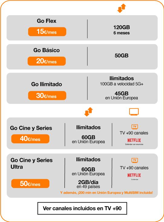 Tarifas Go: Todas las tarifas incluyen llamadas ilimitadas a fijos y móviles nacionales y en roaming en Zona 1 -UE, Islandia, Liechtenstein, Noruega, Gibraltar, Ucrania y Moldavia. Tarifas de uso exclusivo para clientes particulares en calidad de usuario final sin fines comerciales. Precios no válidos para transformación o conversión de llamadas incluido redireccionamiento del tráfico, descargas masivas de tráfico telefónico o de datos, conductas que respondan a un patrón de fraude, uso anómalo, ilícito y/o desmesurado del Servicio. En caso de que utilice el servicio con los anteriores fines, así como en supuestos de fraude, Orange podrá tarificar el tráfico conforme al precio base de llamadas (0,25€/minuto y 0,30€ de establecimiento de llamada) o suspender o interrumpir el servicio. SMS: 0,25€. Las tarifas Go Cine y Series Ultra y Go Cine y Series incluyen datos ilimitados sin restricción de velocidad, destinados a un uso particular razonable y sin fines comerciales, no pudiéndose realizar un uso abusivo de los mismos -p.ej. descargas permanentes de contenidos o aplicaciones de videovigilancia-. La tarifa Go ilimitada incluye datos ilimitados con restricción de velocidad a partir de los 100GB de uso mensual. La tarifa Go Básico y Go Flex incluyen un bono de datos mensual, y, adicionalmente, Go Flex tiene también un bono extra semestral: superados los GB del bono mensual, los GB que consuman se descontarán del bono semestral que el cliente puede utilizar en cualquier momento durante 6 meses desde la activación de la tarifa o desde cada renovación semestral. Los GB del bono mensual no utilizados no son acumulables. Go Flex con bono de 10GB al mes y 60GB al semestre (120GB en total). En caso de haber agotado todos los GB se aplicará el servicio ‘Más Megas Multi’, con un coste de 2,95€ por cada tramo de 500Mb, con un máximo de 30 tramos/mes. Este servicio podrá desactivarse en cualquier momento y la velocidad de navegación será de 16kbps. En todas las tarifas pueden usarse los GB mensuales mencionados en Roaming Zona 1 -UE, Islandia, Liechstenstein y Noruega, Gibraltar, Ucrania y Moldavia, a excepción de las tarifas con GB ilimitados, teniendo los siguientes máximos de uso: 60GB en Go Cine y Series Ultra y Go Cine y Series; 45GB en Go ilimitada. Las tarifas Go Cine y Series Ultra y Go Cine y Series cuentan con servicio de televisión prestado por Orange TV, con +90 canales, y también suscripción a Netflix (Plan Estándar en Go Cine y Series Ultra; Plan Estándar con anuncios en Go Cine y Series), que el cliente necesitará activar siguiendo el proceso facilitado por Orange. La tarifa Go Cine y Series Ultra incluye el servicio MultiSIM, específica para wearables, con velocidad de navegación de 1Mbps. La activación de las MultiSIM tiene un coste de 5€ por SIM. Las tarifas Go Básico y Go Flex cuentan con una cuota de alta promocionada de 25€ que el cliente solo abonará si da de baja la tarifa antes de los 3 meses desde su activación. Dicha cuota se prorrateará en función del tiempo restante hasta los 3 meses.