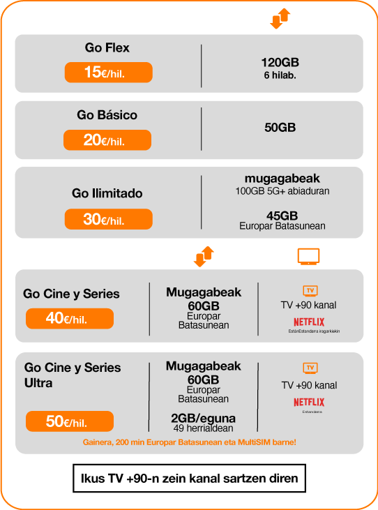 Go tarifak: Tarifa guztiek barne hartzen dituzte estatuko finko eta mugikorretarako dei mugagabeak eta roaming-ekoak 1. eremuan (EB), Islandian, Liechtensteinen, Norvegian eta Gibraltarren. Bezero partikularrek soilik erabiltzeko tarifak, azken erabiltzaile gisa eta helburu komertzialik gabe. Prezio horiek ez dute balio deiak eraldatzeko edo bihurtzeko, trafikoa birbideratzea barne, telefono edo datu trafikoaren deskarga masiboak, iruzur ereduari erantzuten dioten jokabideak, zerbitzuaren erabilera anomalo, ez-zilegi eta/edo neurrigabea. Zerbitzua aurreko helburuetarako erabiltzen badu, bai eta iruzur-kasuetan ere, Orangek deien oinarrizko prezioaren arabera tarifatu ahal izango du trafikoa (0,25€/minutua eta 0,30€ dei-ezarpena) edo zerbitzua eten edo utzi. SMS: 0,25€. Go Cine y Series Ultra eta Go Cine y Series tarifek datu mugagabeak abiadura murriztu gabe hartzen ditu barne, arrazoizko erabilera pribatiborako eta merkataritza-helbururik gabe. Ezingo da haien gehiegizko erabilerarik egin -adibidez, edukiak etengabe deskargatzeko edo bideozaintza aplikazio etengabeentzat-. Go Ilimitada tarifak datu mugagabeak dituzte, hileko 100 GB erabili ondoren abiadura murriztuz. Go Básico eta Go Flex tarifek hileko datu-bonu bat eta, Go Flex tarifak gainera, sei hilean behingo bonu bat barne hartzen dituzte: hileko bonuaren GBak gaindituta, kontsumitzen dituzten GBak bezeroak sei hilean behin, tarifa aktibatzen denetik edo sei hilean behin berritzen denetik, erabil dezakeen bonutik deskontatuko dira. Erabili ez diren hileko bonuko GBak ezingo dira metatu. Go Flex hilabetean 10GB-eko bonuarekin eta sei-hilekoan 60GB-eko bonuarekin (120GB guztira). GB guztiak agortu badira, ‘Más Megas Multi’ zerbitzua aplikatuko da, hau da: 2,95€ 500Mb-eko tramu bakoitzeko, gehienez 30 tramu/hilean. Zerbitzu hori edozein unetan desaktibatu daiteke, eta nabigazio-abiadura 16kbps izango da. Tarifa guztietan, aipaturiko hileko GBak Roaming Zona 1 en erabili ahal izango dira -EB, Islandia, Liechstenstein eta Norvegia, eta baita Gibraltarren ere, GB mugatuko tarifak ezik, erabilera maximoak hurrengoak izanik: 60GB Go Cine y Series Ultra-n eta Go Cine y Series-en; 45GB Go ilimitada-n. Go Cine eta Series Ultra eta Go Cine y Series tarifek Orange TVk ematen duen telebista-zerbitzua dute, 90 kanal baino gehiagorekin, bai eta Netflix-en harpidetza ere (Plan Estandar bat Go Cine eta Series Ultran; Plan Estandar bat Go Cine eta Series iragarkiekin). Bezeroak aktibatu egin beharko du zerbitzua, Orangek emandako prozesuari jarraituz. Go Cine y Series Ultra tarifak MultiSIM zerbitzua du barne, wearableentzako espezifikoa, 1Mbps-ko nabigazio-abiadurarekin. MultiSIMak aktibatzearen kostua 5€koa da SIM bakoitzeko. Go Básico eta Go Flex tarifek (Extra eta Prima) alta kuota sustatu bat dute, 25€-koa. Bezeroak aktibatzen duenetik 3 hilabeteko epean baja ematen badu bakarrik ordainduko du. Kuota hori geratzen den denboraren arabera hainbanatuko da, 3 hilabetera arte.